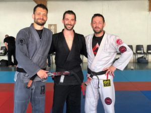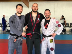 L’Académie Pythagore Angoulême s’enorgueillit de deux ceintures noir supplémentaire en Jiu Jitsu Brésilien. Les nouveaux promus sont Aurélien Barbe et Bastien Giraud, à compter de la rentrée de septembre le cours débutant sera donc dirigé par deux black belt. Quand on sait qu’il faut en moyenne 12ans de pratiques assidues pour obtenir la ceinture noire dans cette discipline on comprend mieux pourquoi c’est un aussi grand événement. Ce fut également la remise du 3ème degré pour Thierry Chauvin qui est l’une des toutes premières ceintures noires d’Emmanuel Fernandez, ainsi que le 1er degré d’Ugo Gaillard, l’enseignant principal de l’Académie d’Angoulême. N’oublions Christophe Pignot qui c’est vu remettre la ceinture bleue. Malgré une température accablante Manu a offert à ses élèves 4h de stage des plus intéressants, en comité restreint ce qui lui a permis d’avoir une attention toute particulière avec chacun d’entre eux.