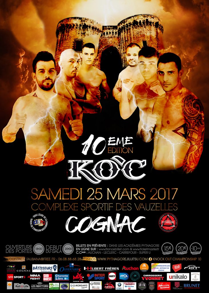 Le KOC Prestige étant passé, on vous attend maintenant le samedi 25 mars 2017 au Complexe Omnisport des Vauzelles pour la Xème Edition du Knock Out Championship de Cognac (16) avec une carte Exceptionnelle de 14 combats……!