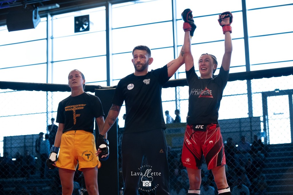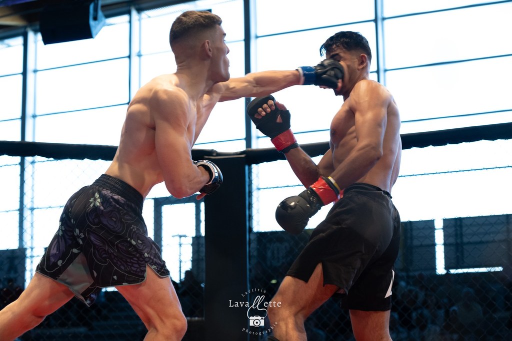 Le deuxième combat de la soirée a particulièrement retenu l’attention. Simon Devilliers, licencié à l’Académie Pythagore Angoulême pour sa 2ème année, effectuait sa toute première apparition en gala. Militaire de profession, au 1er RIMA, son emploi du temps ne lui a pas toujours permis de s’entraîner autant qu’il l’aurait souhaité, mais sa prestation a balayé tous les doutes : sérieux, appliqué, il a maîtrisé chaque phase de combat avec justesse. Boxe, lutte, sol… un sans-faute technique et tactique.